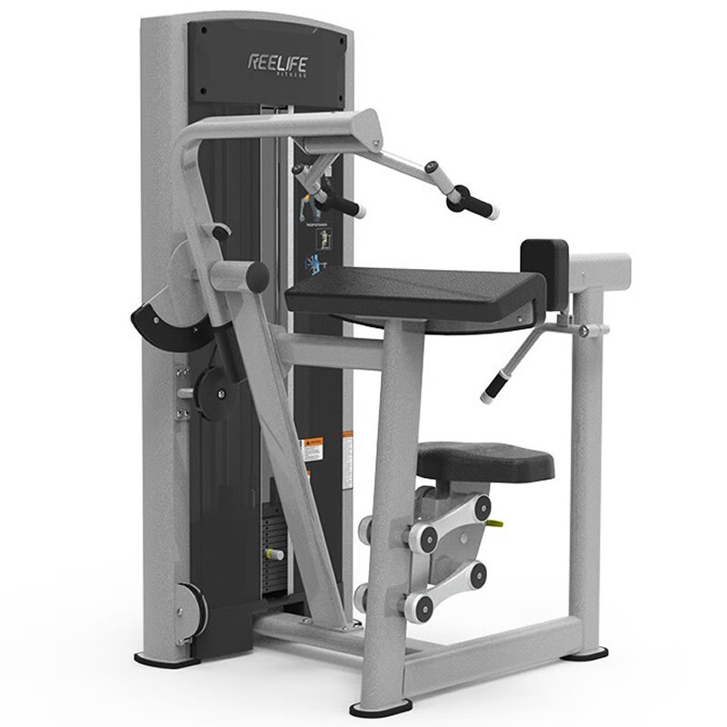 REELIFE Fitness HERO 系列 HE16SPP 三头肌伸展训练器的活动力臂具有平衡铁,使力臂启动阻力降至最低。凸轮盘结构,使得钢索运行的起始重量至末端始终一致。自调整手柄几乎能适应所有身材锻炼者前臂长度。